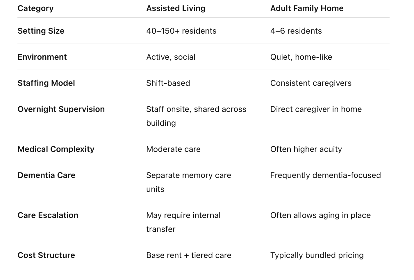 Both assisted living communities and adult family homes provide care and housing. The right choice depends on medical needs, cognitive status, personality, and financial sustainability in the Puget Sound market.